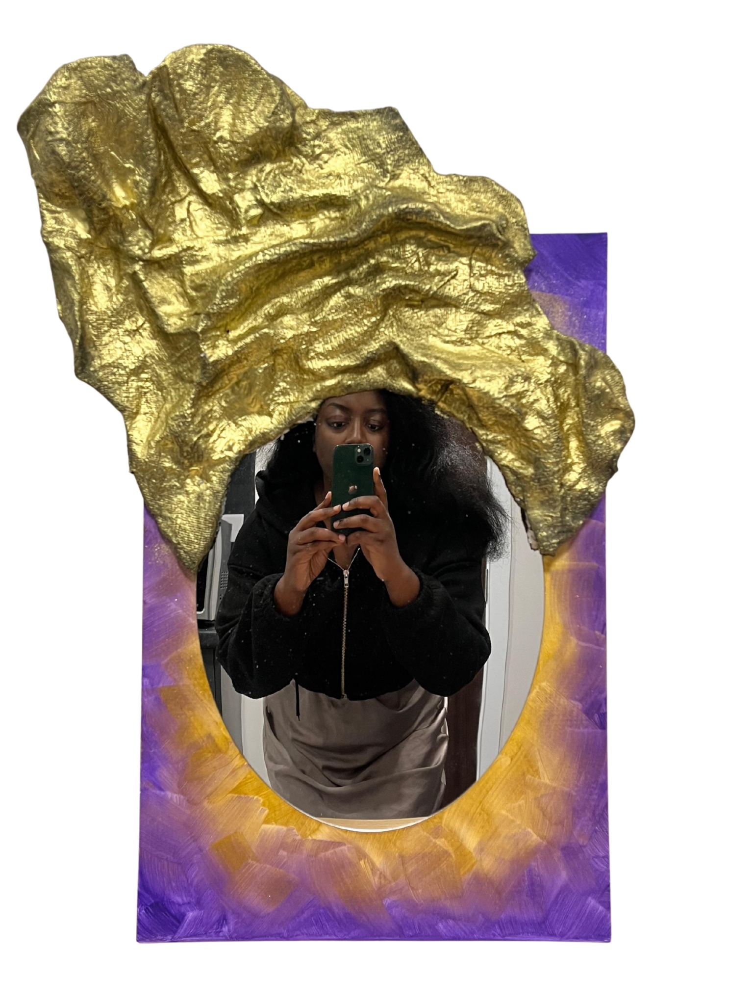 “African Queen I” is part of an abstract series where the artist explores audience interaction and participation. This piece invites the observer to draw in, look into the mirror and imagine themselves wearing a gele.