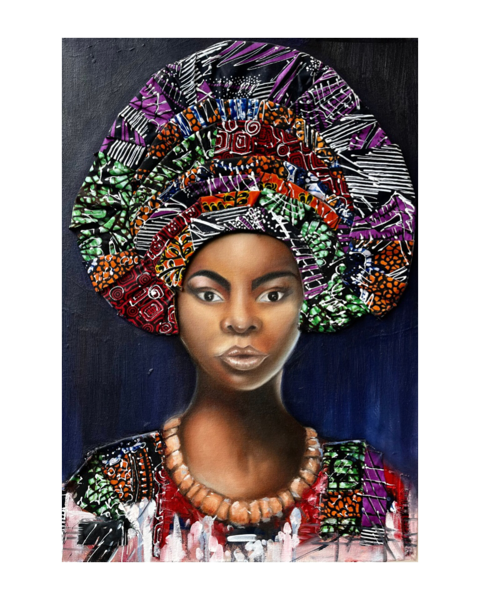 The striking realism of the woman depicted is contrasted by the additions of colourful fabric to her top and to the abstracted gele that sits on her head. Her African dignity emerges from a contrasting dark navy background. Her neckline is adorned with a painting of traditional large coral beads.