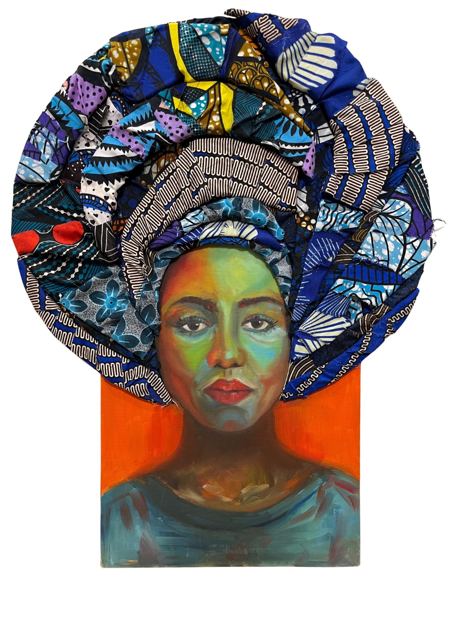 To depict the gele (African head dress) I use locally sourced African print fabrics. I use a formwork of board to create depth and structure, then I cut them into shapes before wrapping each wedge with fabric. I stick everything down with a combination of UHU and PVA glue.