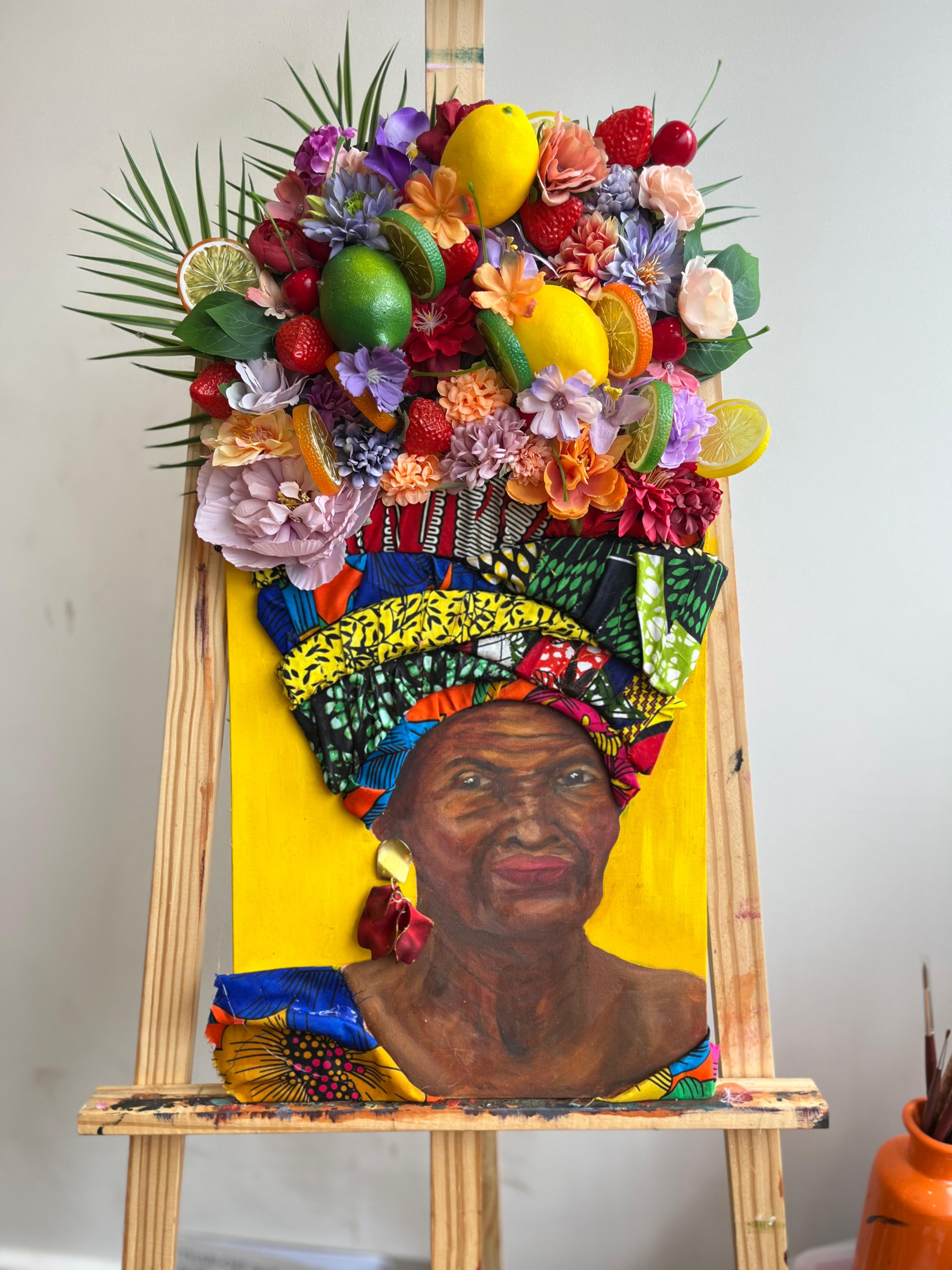 “Madam Ulo” is a vibrant portrait depicting an elderly woman in all her vivacity. She is expressive, she carries potential on her head, and she is stunning.