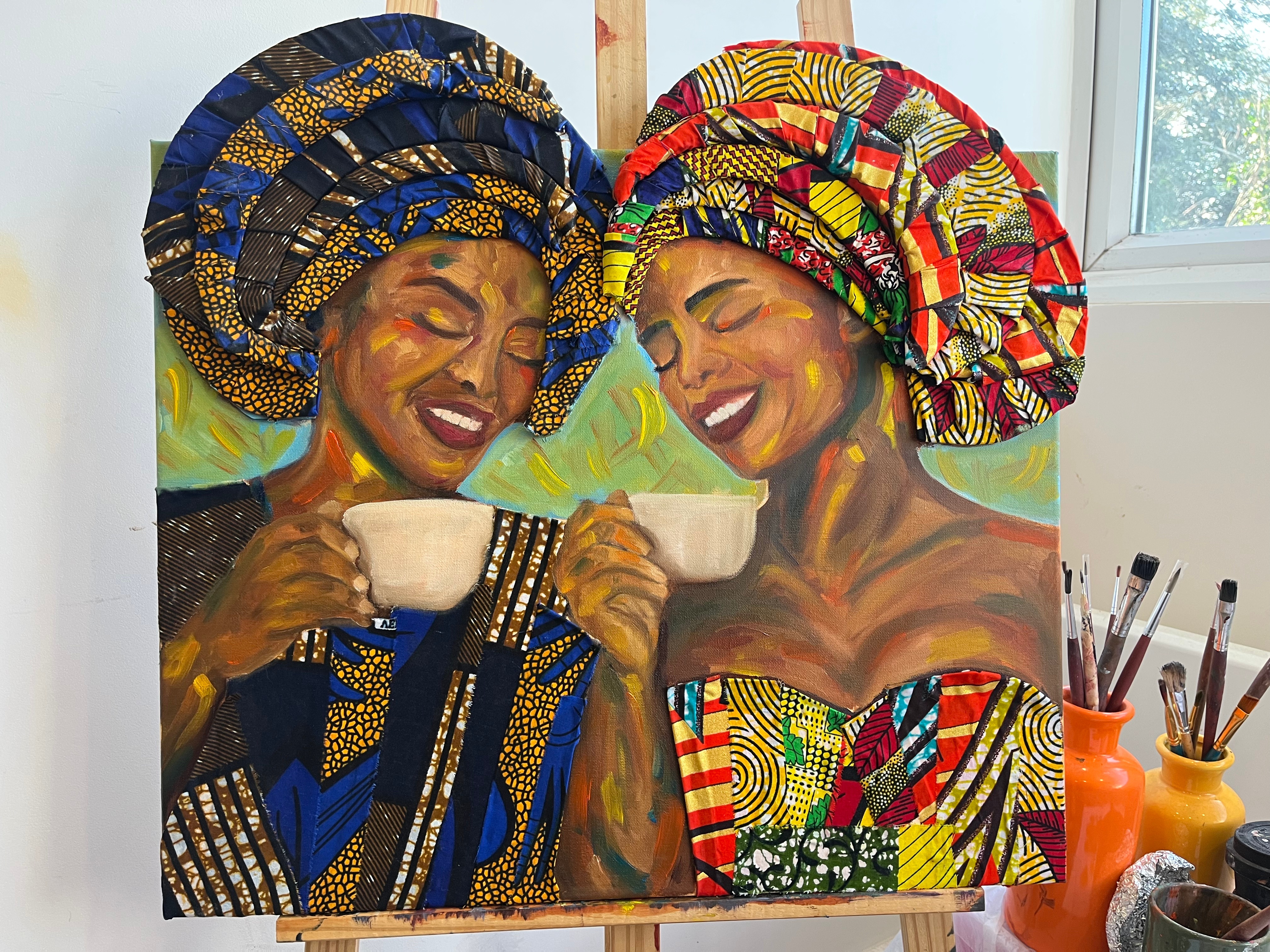 This painting represents how the gele can become a piece of attire that highlights the celebratory aspect of everyday moments, like sipping tea together.