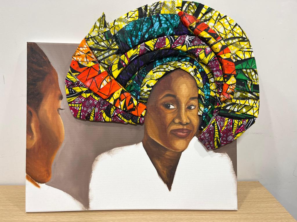 She observes that her likeness has a gele crowning her head, which differs from the woman’s present state, depicted on the far left.